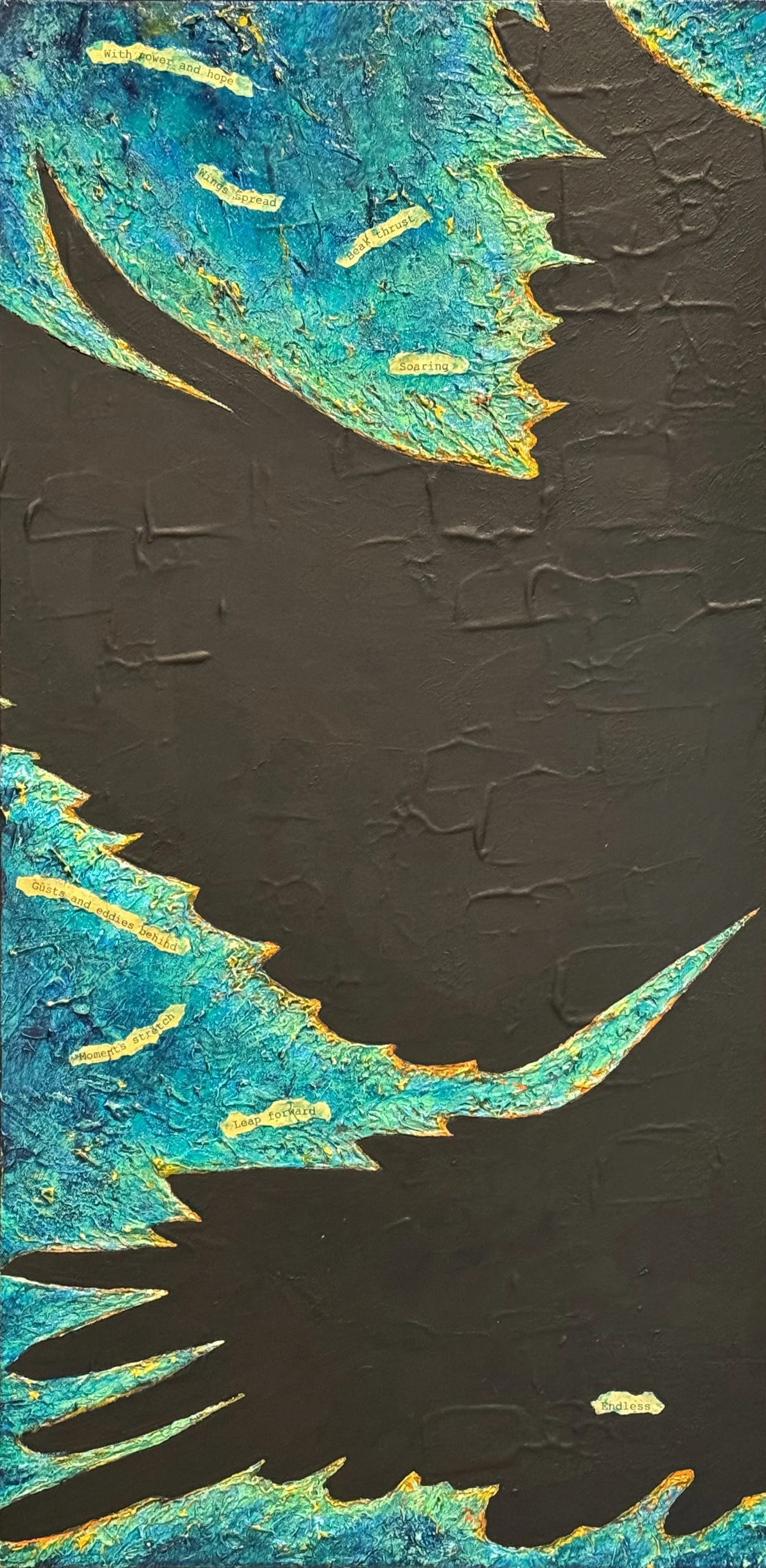 Take Flight 12 x 24 mixed media acrylic on canvas, done with textured gesso and pallet knife techniques.